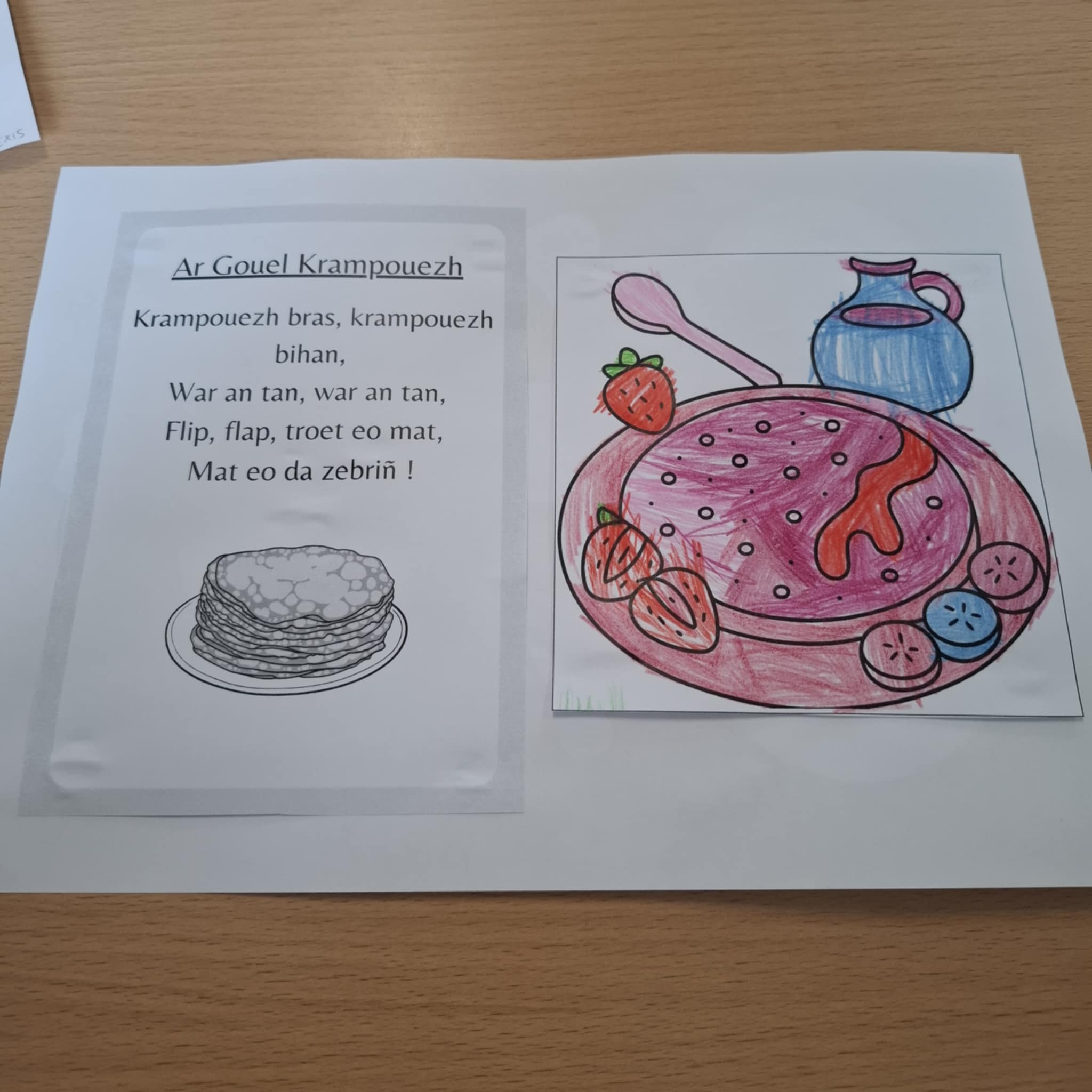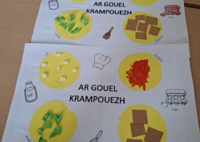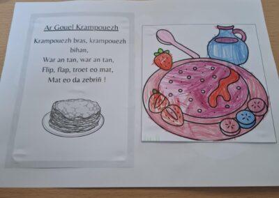 A l’occasion de la chandeleur, les élèves de TPS-PS-MS ont appris quelques mots de vocabulaire, en breton, de la recette des crêpes : laezh, sukr, vioù, krampouezh, chokolad, bleud, etc.